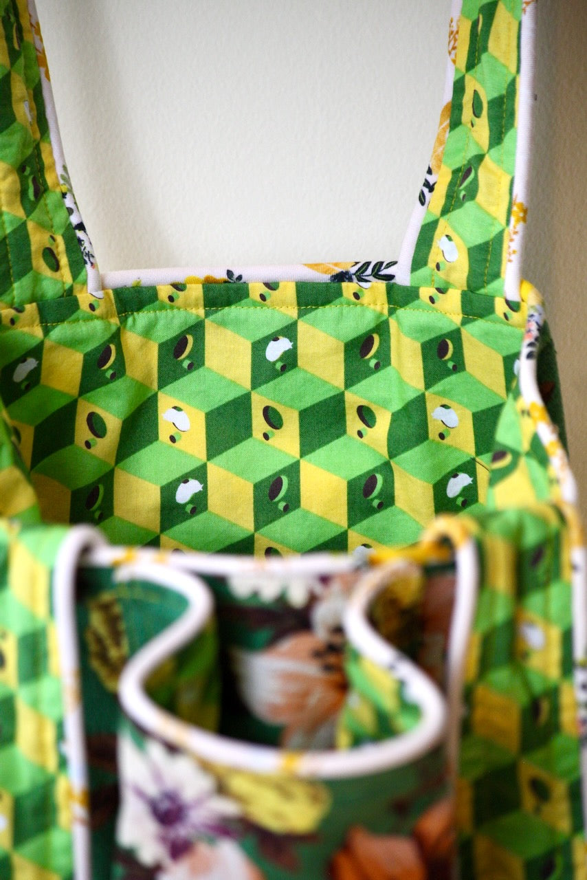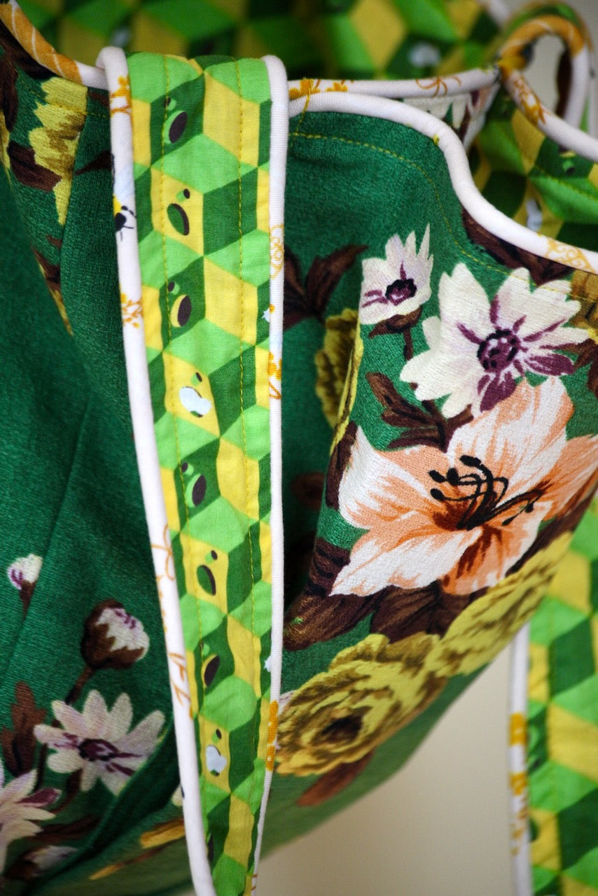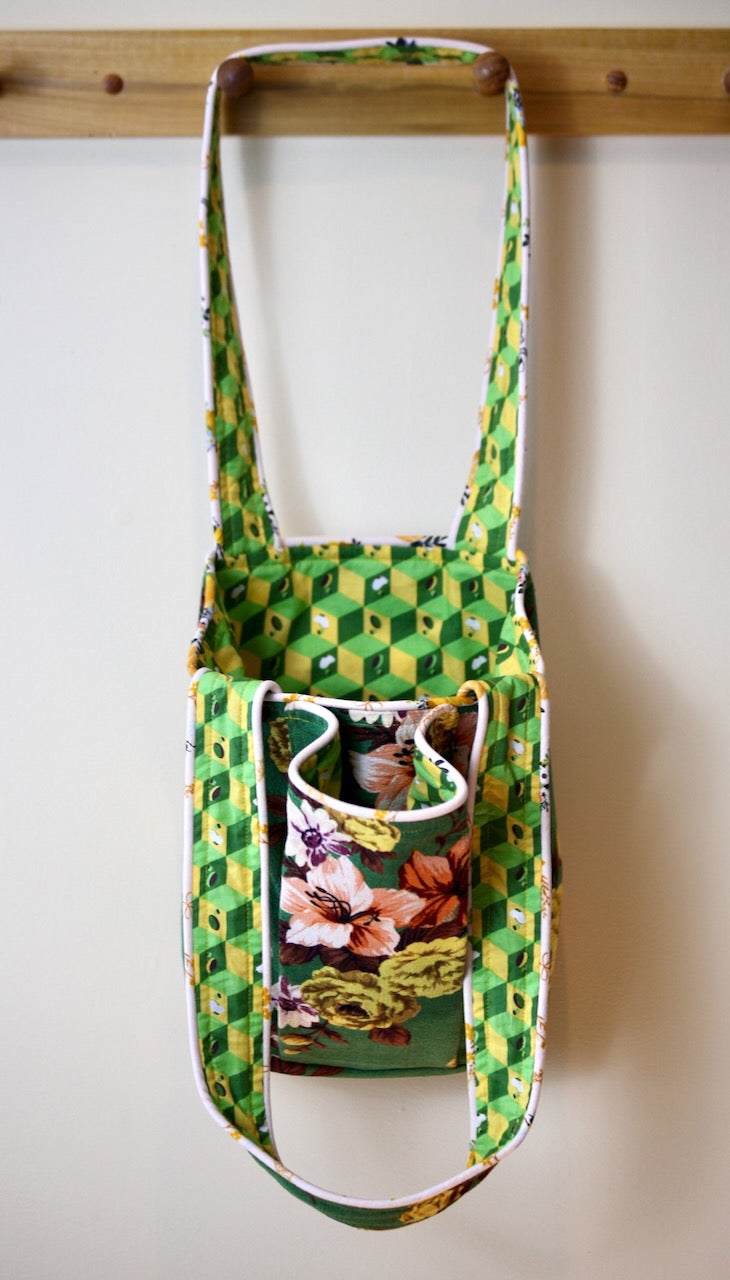 I did a little dance in the studio when I found this remnant in a random bin. There was just enough of this contemporary “Elaine” barkcloth from Outback Wife by Gertrude Made to create this little gem. The lining is called “NEST” by Tula Pink for Moda, and I have no idea where this yardage came from, but it works wonderfully with “Elaine.” The piping fabric is a subtle shade of pink that complements the variations of green in the other two fabrics to create a combination that I love for this charming bag.