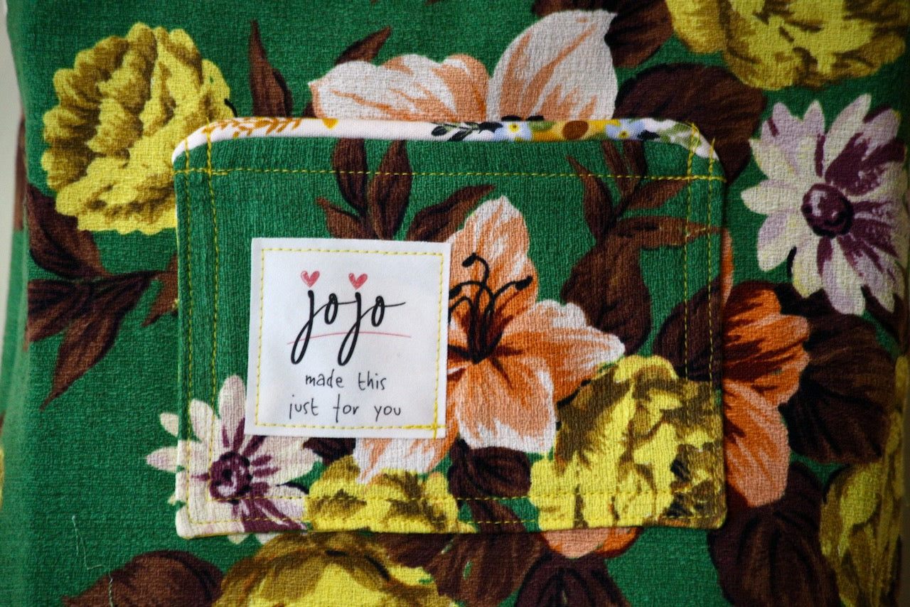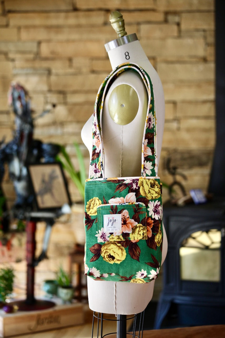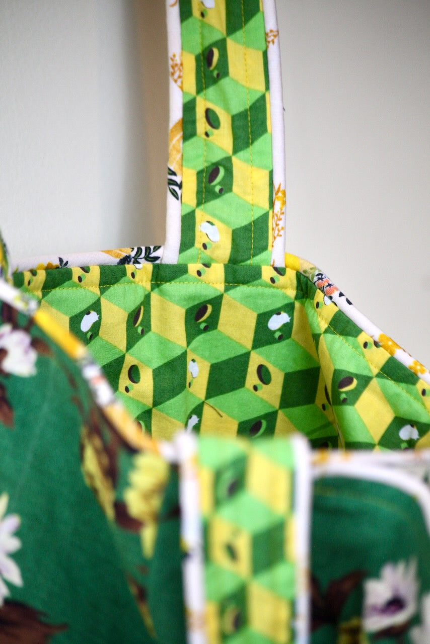 I did a little dance in the studio when I found this remnant in a random bin. There was just enough of this contemporary “Elaine” barkcloth from Outback Wife by Gertrude Made to create this little gem. The lining is called “NEST” by Tula Pink for Moda, and I have no idea where this yardage came from, but it works wonderfully with “Elaine.” The piping fabric is a subtle shade of pink that complements the variations of green in the other two fabrics to create a combination that I love for this charming bag.