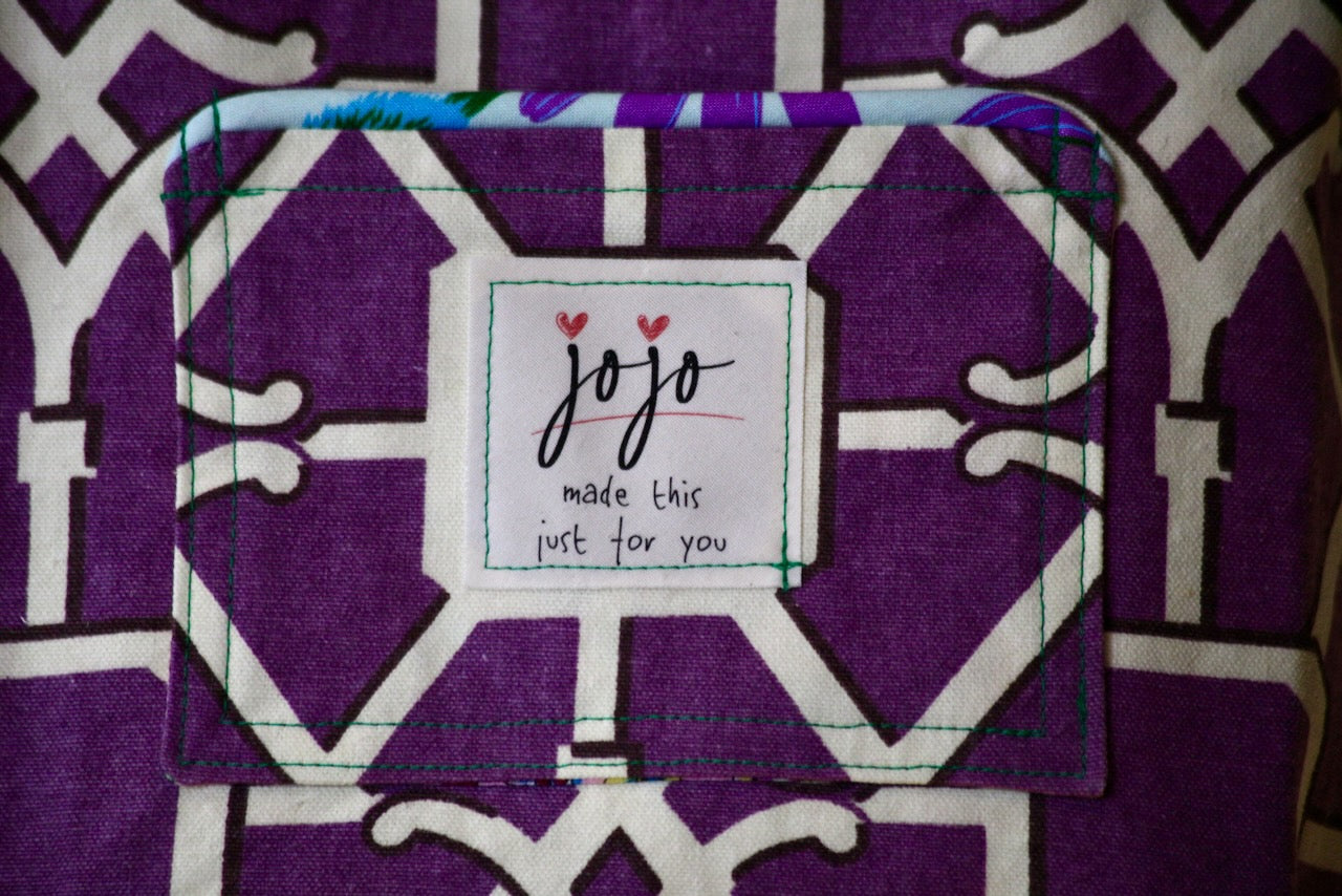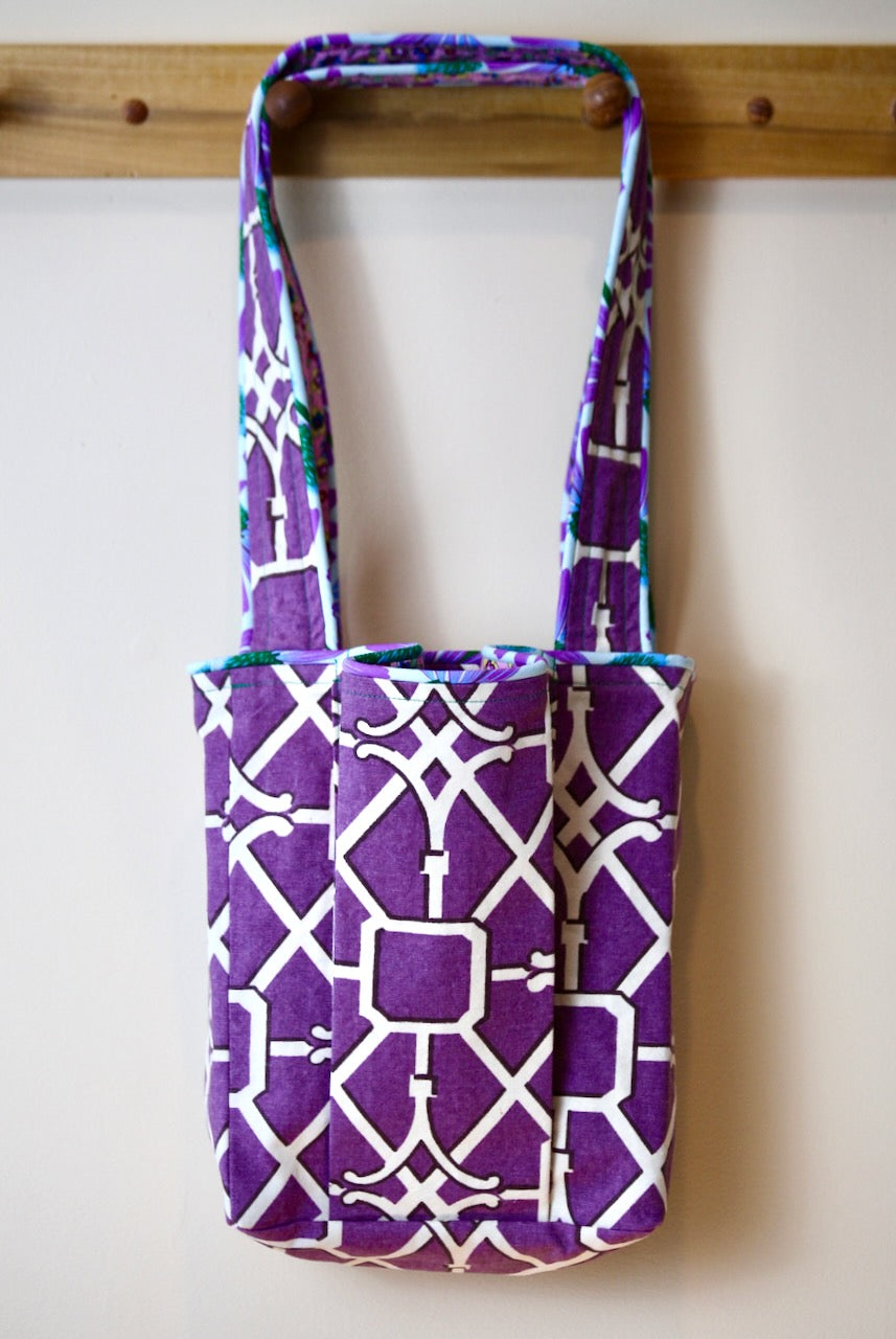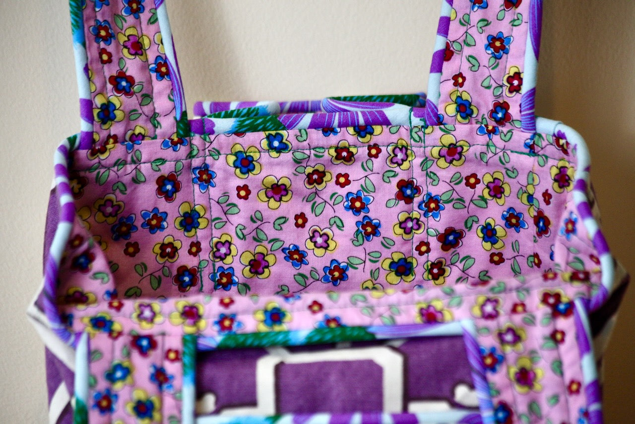 Purple is such a magical color but finding purples that work together can be tricky. This exterior fabric is called “Network” and it reminds me of stained glass. I purchased this Waverly upholstery fabric at Foam & Fabric Outlet, home to so many treasures. I knew that I wanted to use the turquoise and purple “Echinacea” from Free Spirit Presents Love Always, AM by Anna Maria in this bag but I only had enough for piping. The hunt was on for an interior fabric that would coordinate with the others and discovered this little treasure with pink background and lots of small blue, purple, red and yellow flowers in one of my remnant bins. I love the way each bag comes together in its own way!
