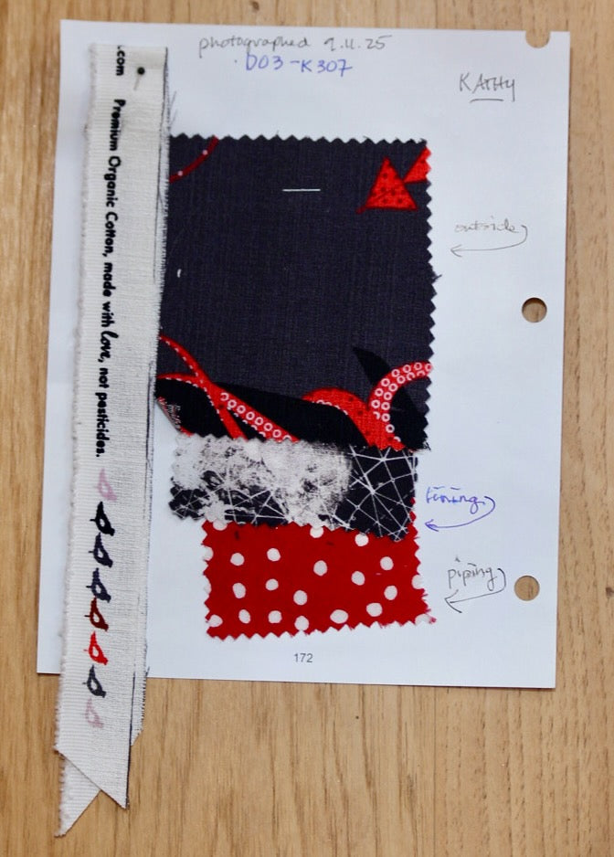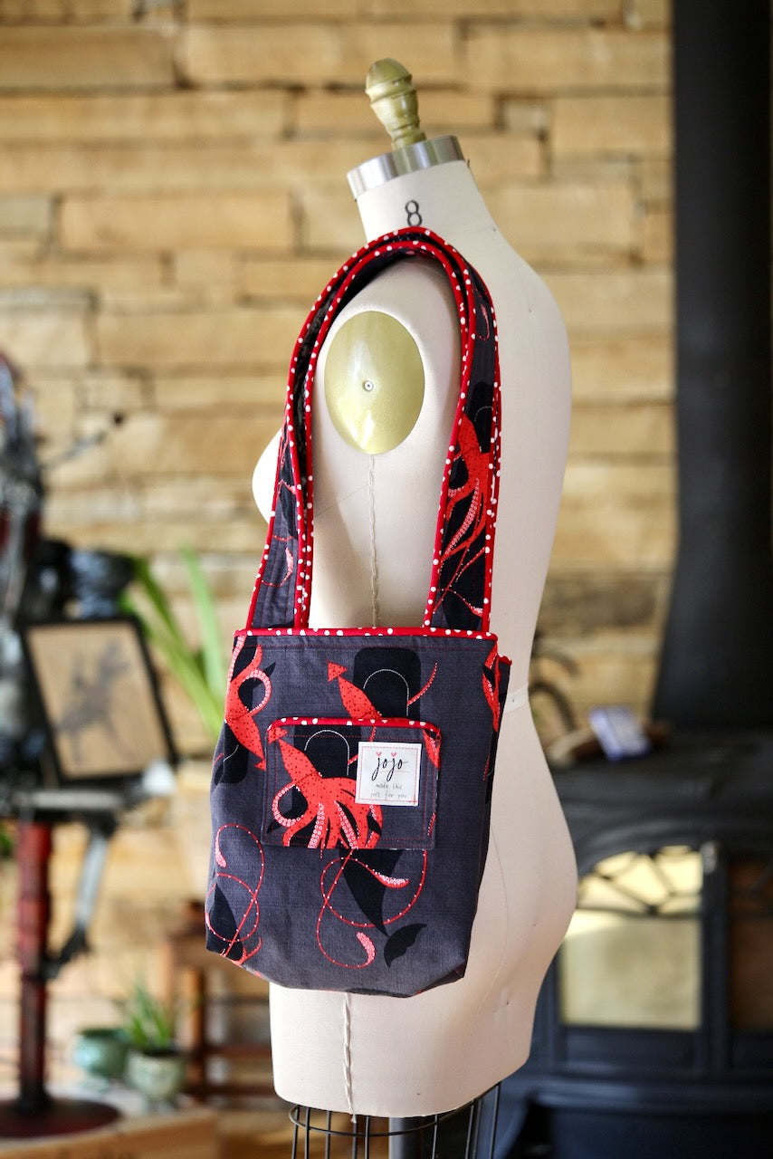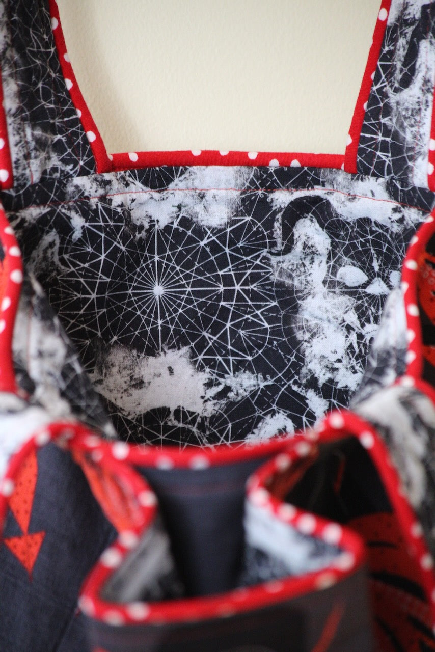 This exterior Charley Harper barkcloth design, “Squid and Whale” for Birch Fabrics, was my first exposure to the artist’s work. I’d never seen any kind of fabric design like this before. I was inspired! I laid it out and the pattern worked beautifully on the bag yardage. Next, I picked out this devilishly weird, spooky, astrological print at Foam and Fabrics Outlets for the lining. Last, but not least, I pulled the white polka dot on red background out of my piping stash. A match made in bag design heaven!