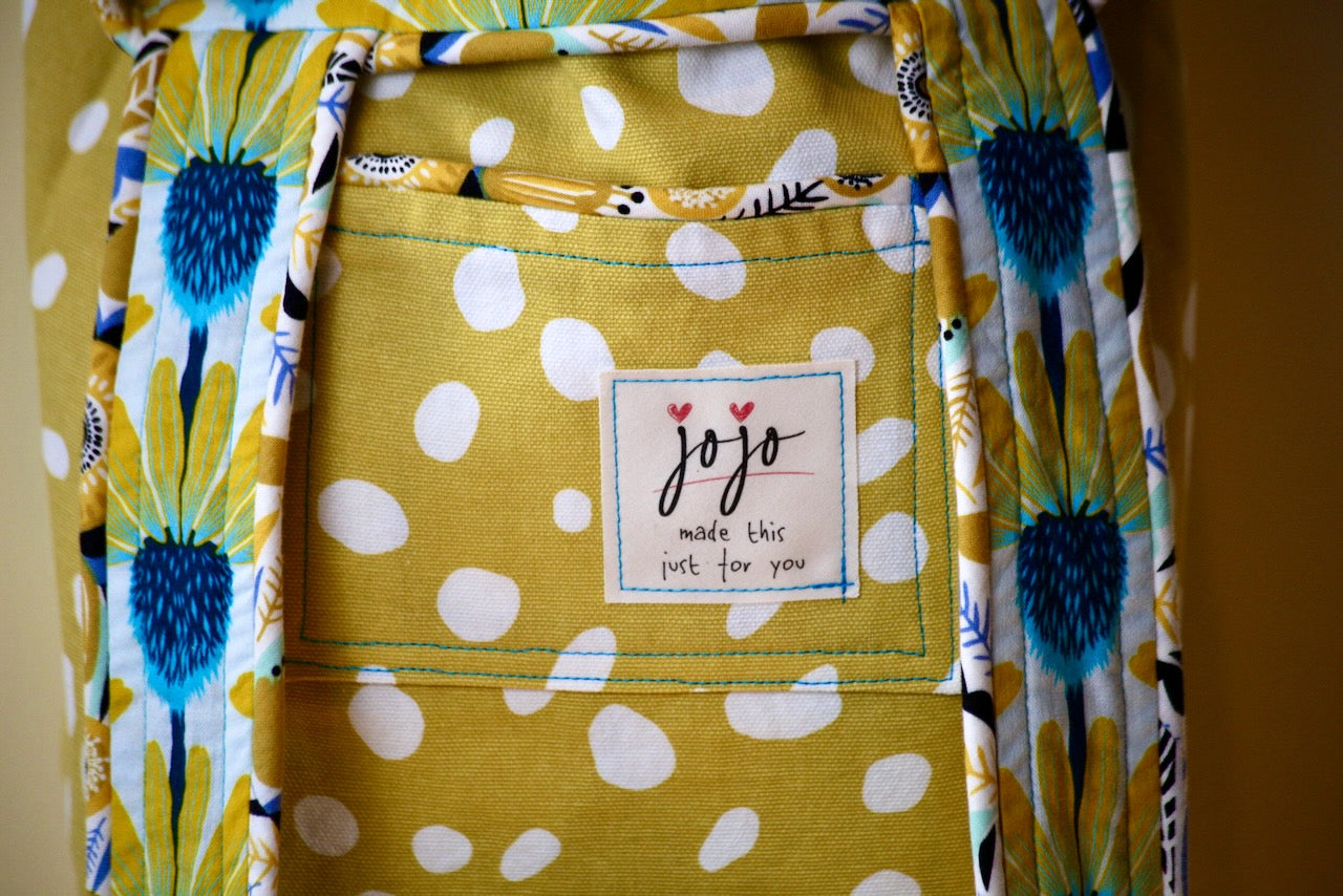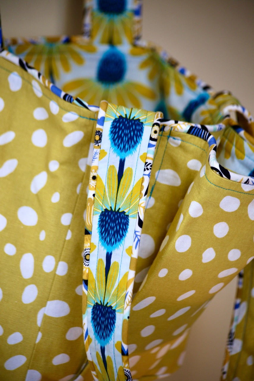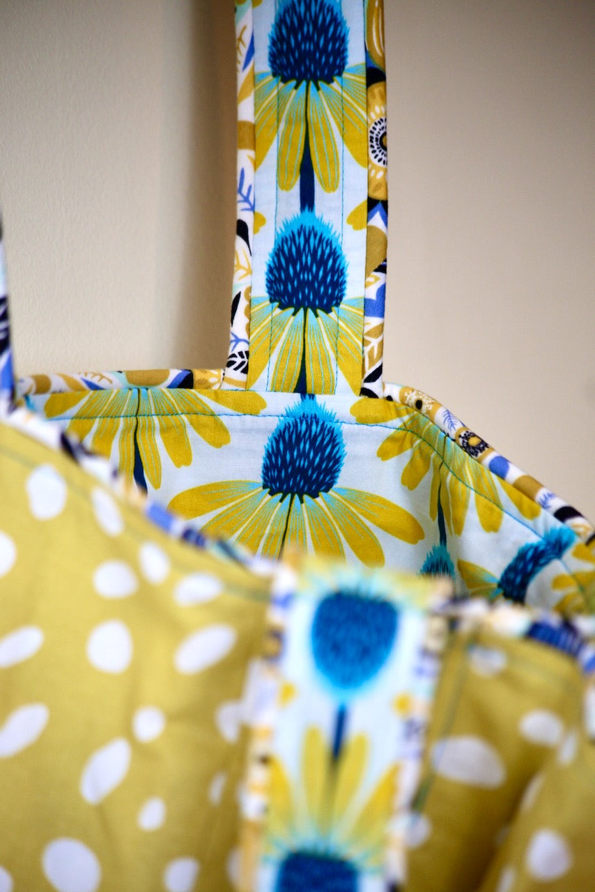 If Wilma Flintstone and Betty Rubble were out fabric shopping and Wilma got the orange polka dot fabric from Foam & Fabric Outlet (see D03-L301 to spot the dots!), perhaps Betty would get the same fabric, but in mustard! The echinacea patterned lining, aptly named “Echinacea,” is the perfect color combo of turquoise and mustard for this little Kathy bag. Free Spirit Presents Love Always, AM by Anna Maria had the right idea to create this lining design in a multitude of color variations that I’ve used elsewhere. It’s like an Andy Warhol moment. The sweet piping remnant helps tie it altogether.