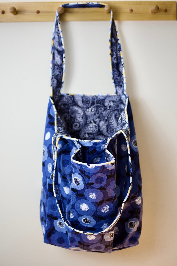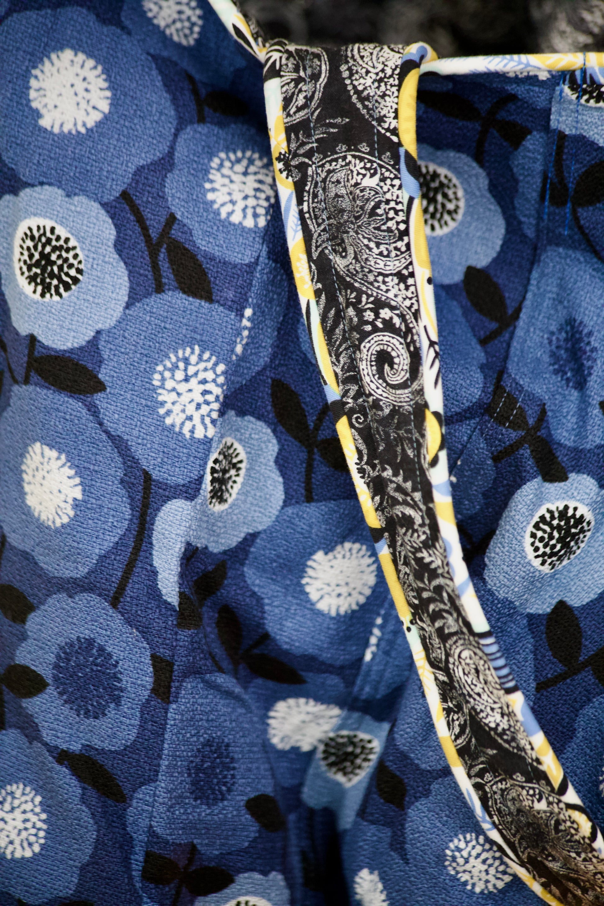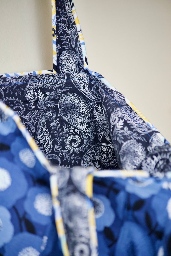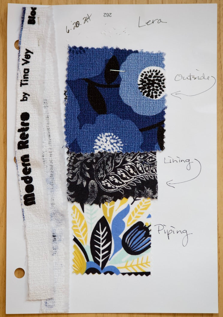The exterior fabric, “Blooms (Blue),” is an organic cotton barkcloth from Modern Retro by Tina Vey. Her use of blue shades sprinkled with black and white always makes me smile! I found the interior lining in my stash, and it felt like the perfect match. The piping fabric came from my remnant bin, and I was sweating the entire time, measuring and cutting, hoping there’d be enough for this Lera. I guess you know how that story ended!