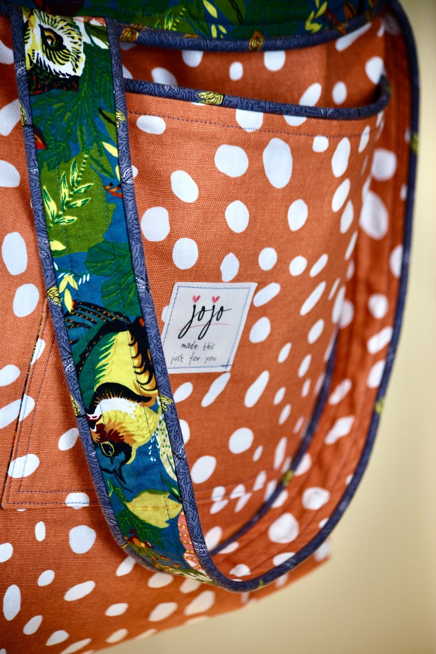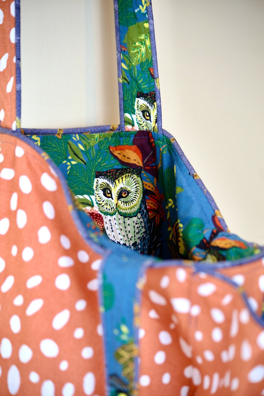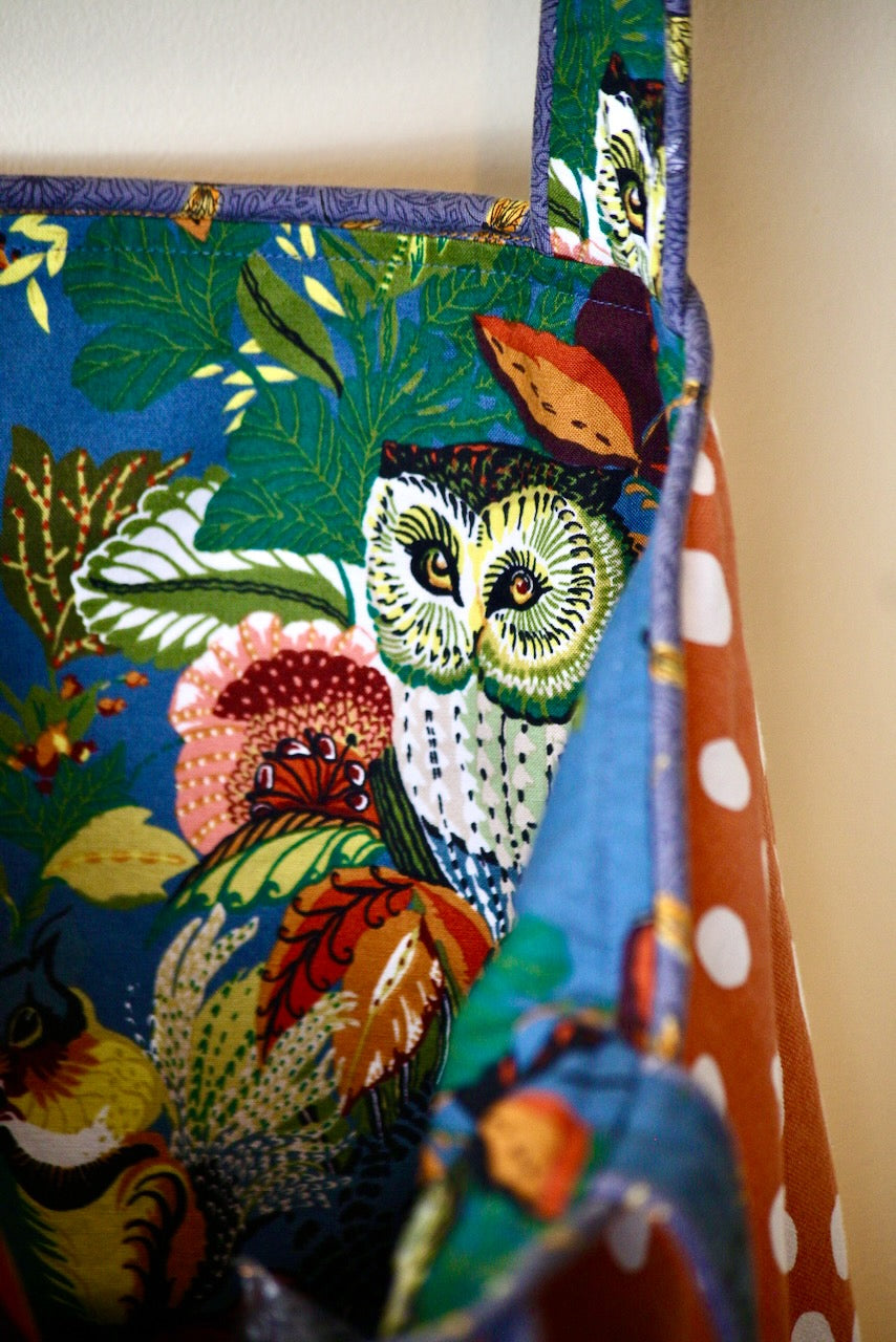This Wilma Flintstone-inspired polka dot print was purchased at Foam & Fabrics Outlet in Fletcher, NC. It’s just like something Wilma would have worn! I loved it immediately, even if there were no selvage markings on this remnant of lightweight canvas. The lining is called “Harvest Owl & Squirrel,” in a lovely array of autumnal colors designed by DeLeon Design Group for The Alexander Henry Fabrics Collection, 2019. The piping fabric is “Mellow Yellow” from Satin Moon Designs for The Blank Quilting Corp. Dragonflies are everywhere, right Johnny Pardo?