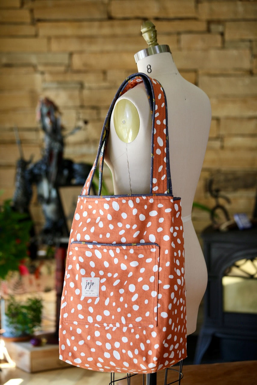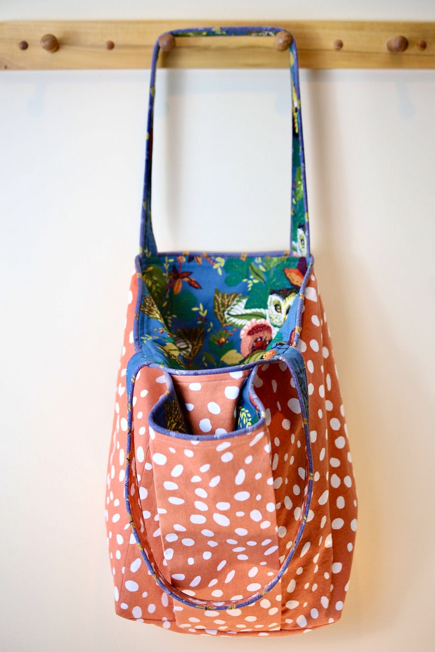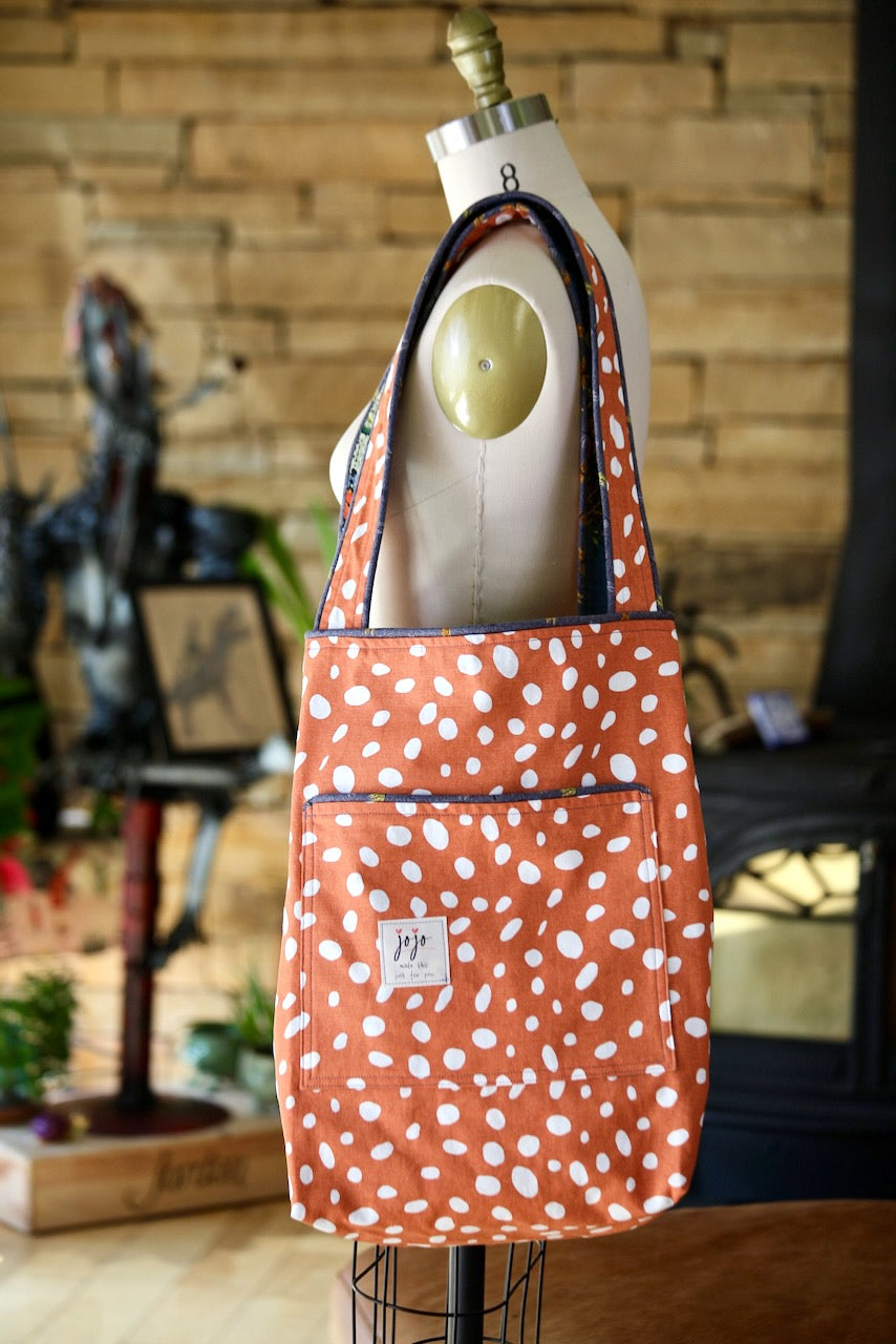 This Wilma Flintstone-inspired polka dot print was purchased at Foam & Fabrics Outlet in Fletcher, NC. It’s just like something Wilma would have worn! I loved it immediately, even if there were no selvage markings on this remnant of lightweight canvas. The lining is called “Harvest Owl & Squirrel,” in a lovely array of autumnal colors designed by DeLeon Design Group for The Alexander Henry Fabrics Collection, 2019. The piping fabric is “Mellow Yellow” from Satin Moon Designs for The Blank Quilting Corp. Dragonflies are everywhere, right Johnny Pardo?