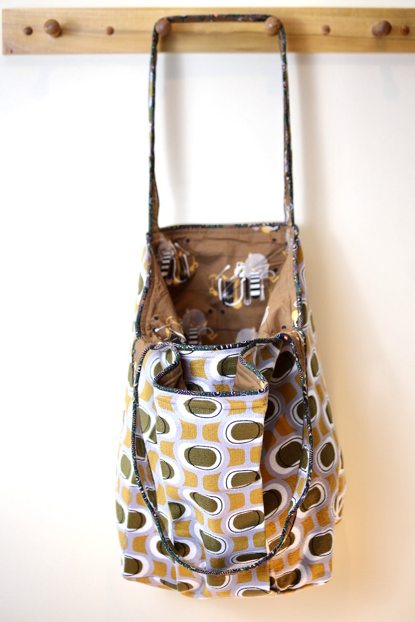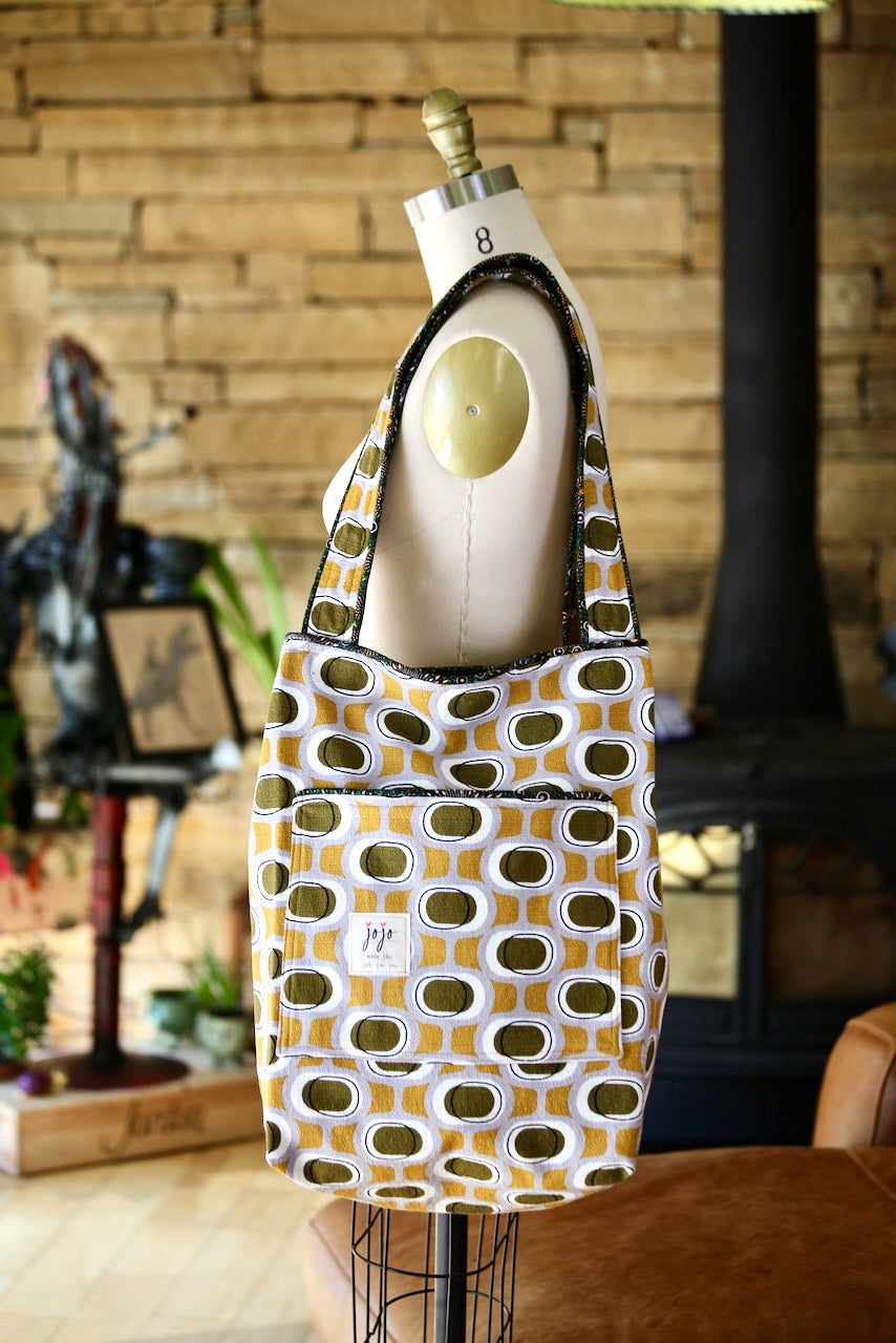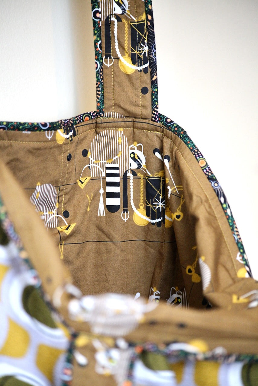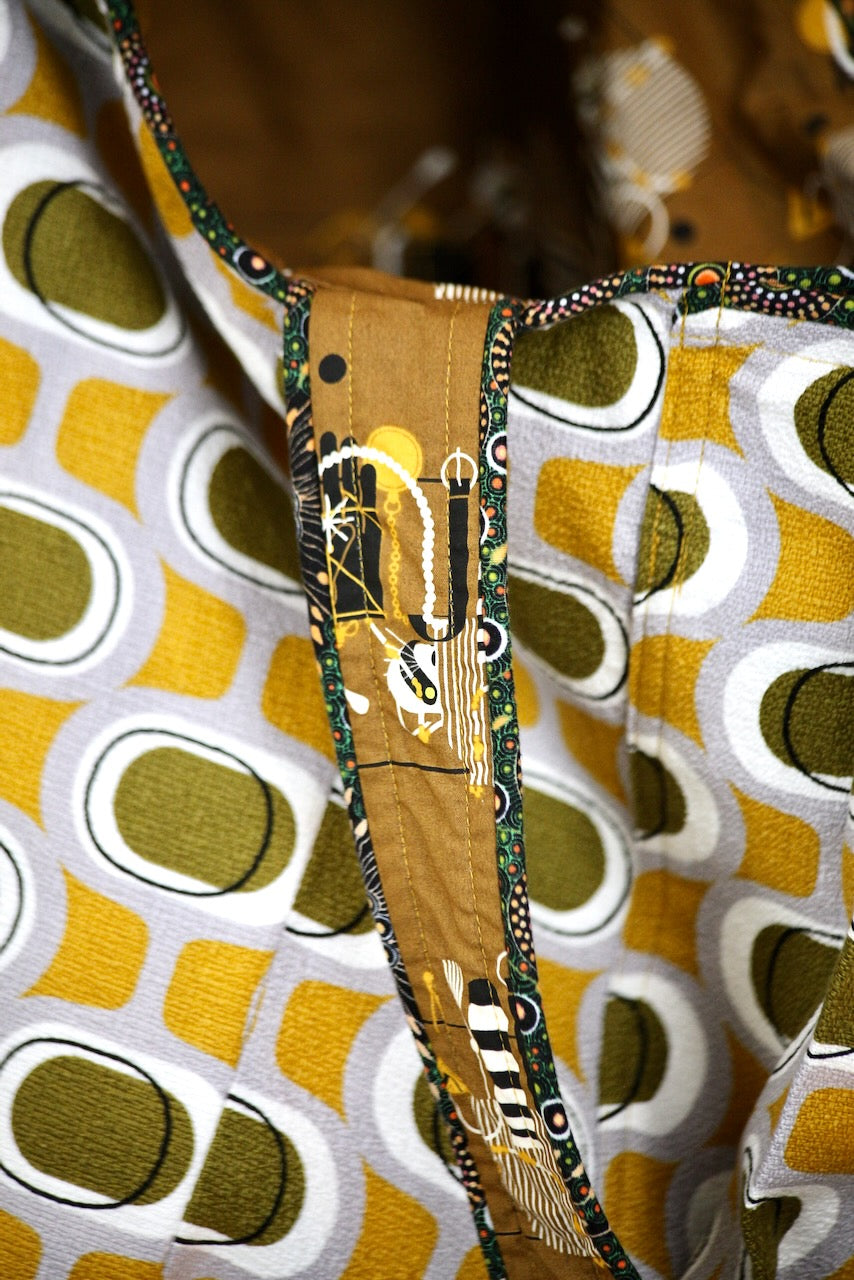 Wowee! I love this Modern Retro by Tina Vey called “Orbs.” The colors of mustard and khaki on a grey background are so groovy. The barkcloth is a 100% certified organic cotton from Cloud 9. It fits beautifully with Charley Harper’s Cats & Raccs for Birch Fabrics, another premium organic cotton. These two fabrics were made for each other! The piping fabric is “Onion Dreaming,” by Doris Inkamala for M & S Textiles in Australia, although I found it on this side of the world at Asheville Cotton Company.