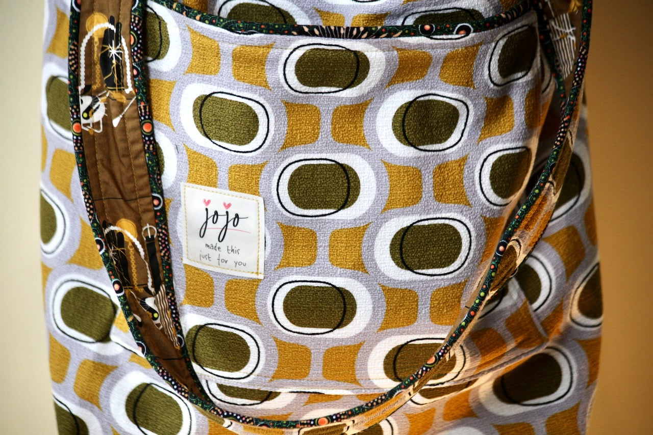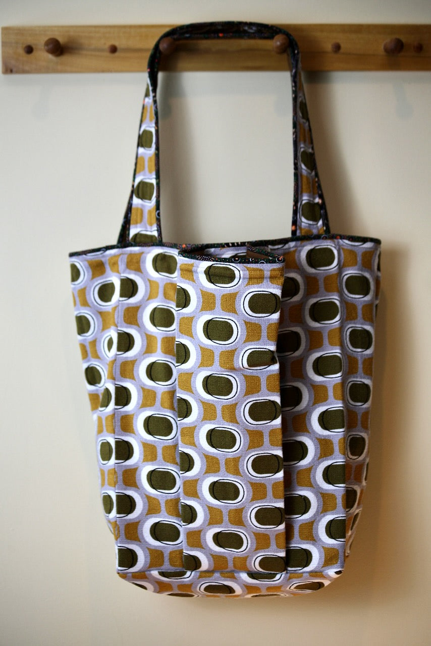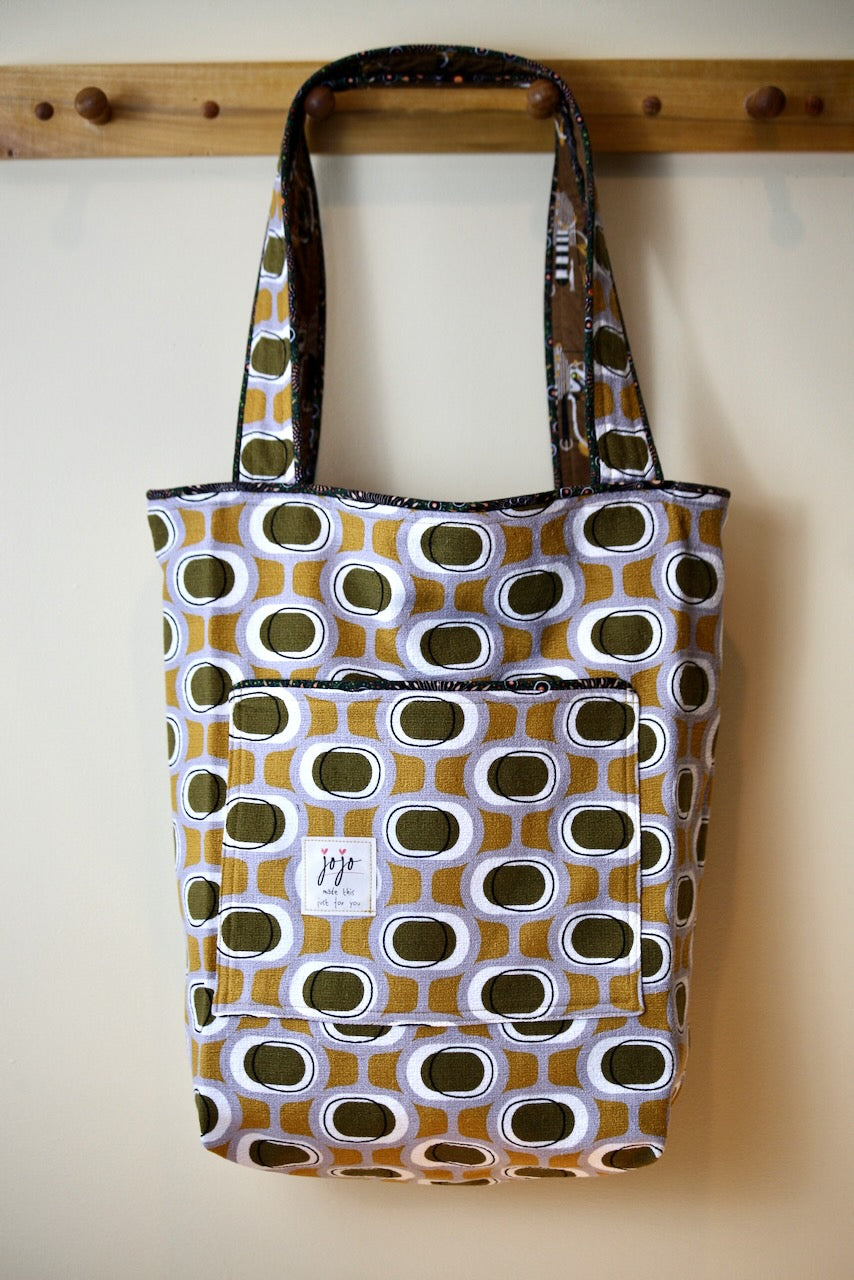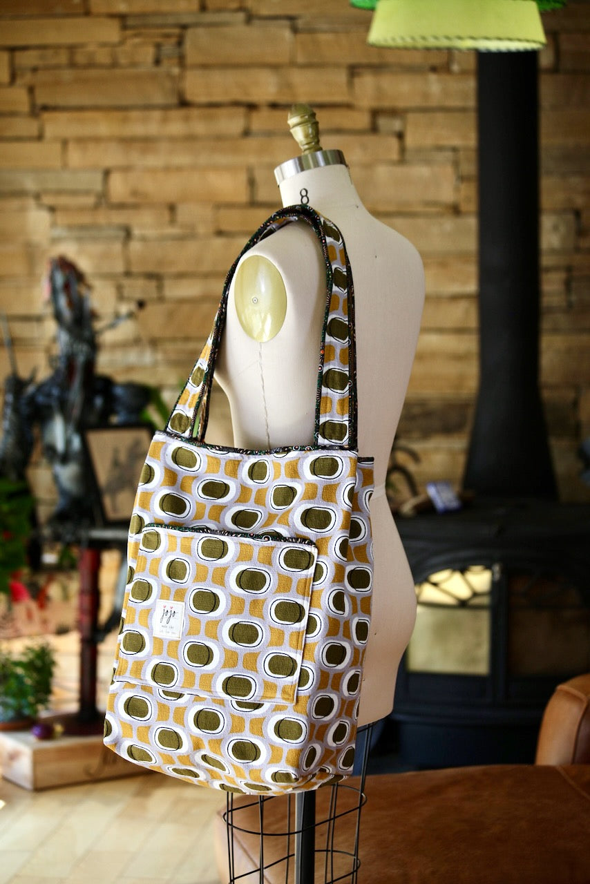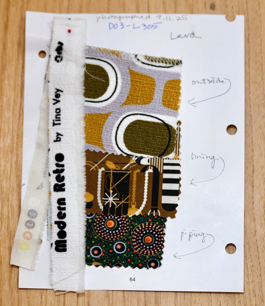 Wowee! I love this Modern Retro by Tina Vey called “Orbs.” The colors of mustard and khaki on a grey background are so groovy. The barkcloth is a 100% certified organic cotton from Cloud 9. It fits beautifully with Charley Harper’s Cats & Raccs for Birch Fabrics, another premium organic cotton. These two fabrics were made for each other! The piping fabric is “Onion Dreaming,” by Doris Inkamala for M & S Textiles in Australia, although I found it on this side of the world at Asheville Cotton Company.