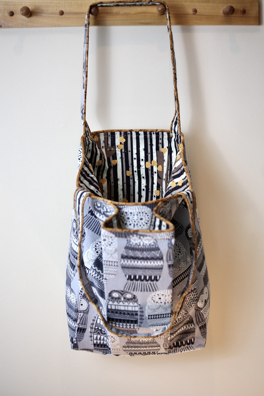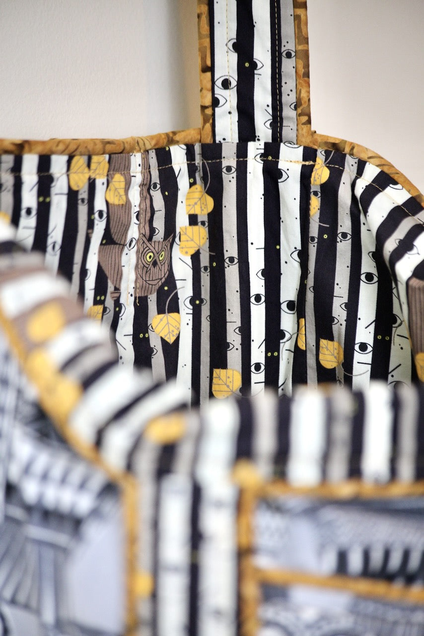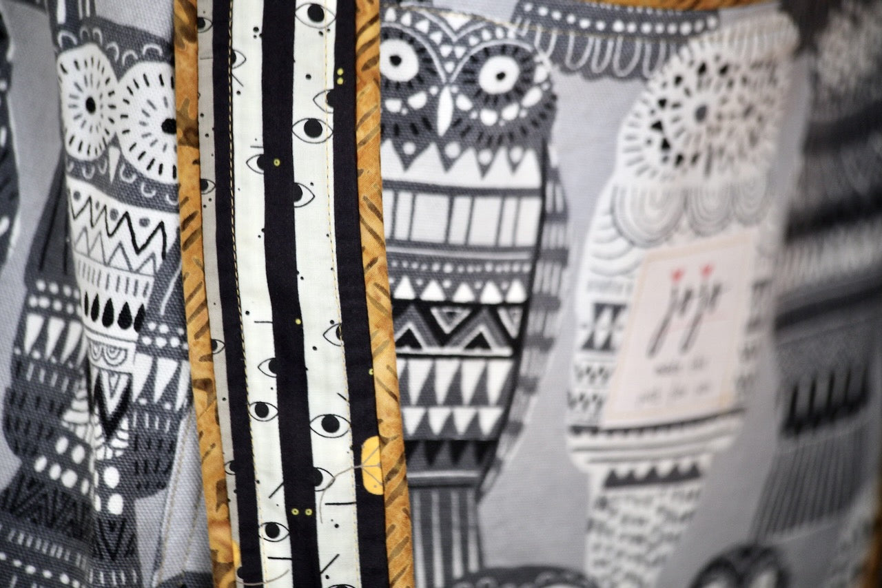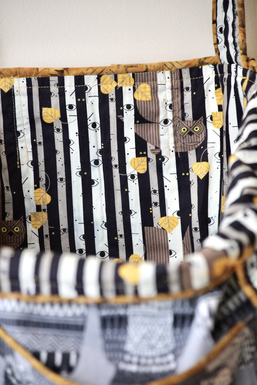 This adorable owl-themed lightweight upholstery fabric reminds me of those Russian nesting dolls, and I laughed out loud when I saw it at Foam & Fabric Outlet. I knew it would be a perfect match with Charley Harper’s design from Harvest Volume 1 for Birch Fabrics. The owls and eyes peering through the trees in a spooky dark forest work so well with the Russian owls! The piping is from my stash and gives the bag a nice pop of color that adds to the delight.
