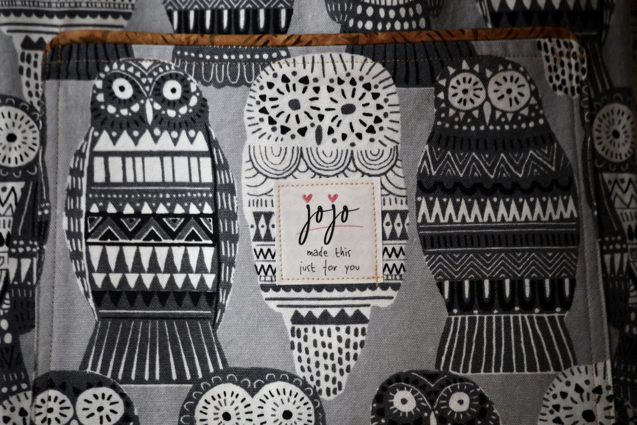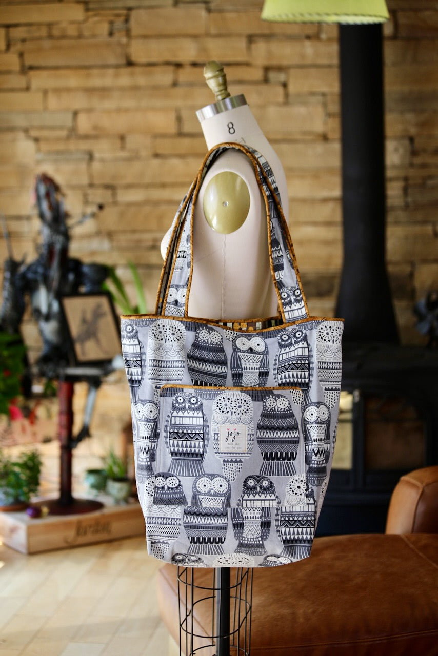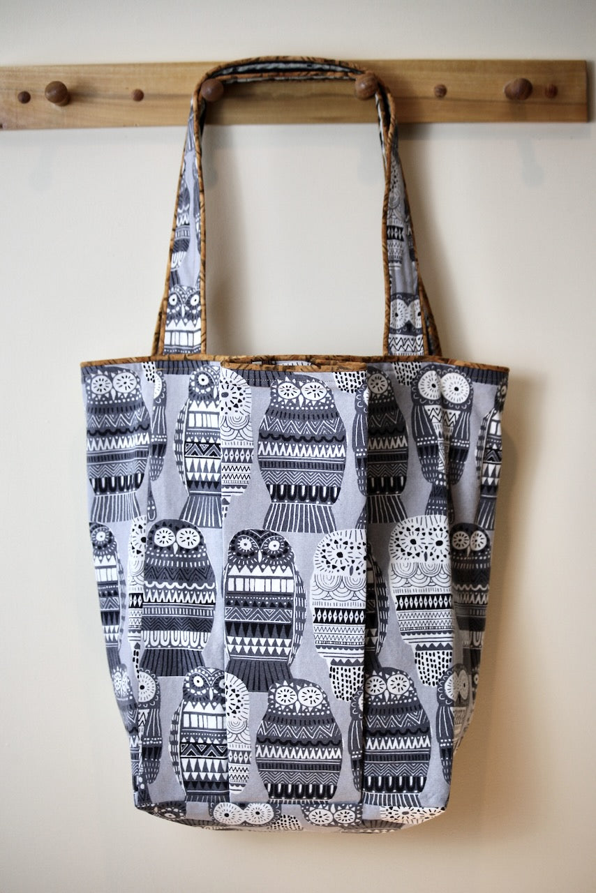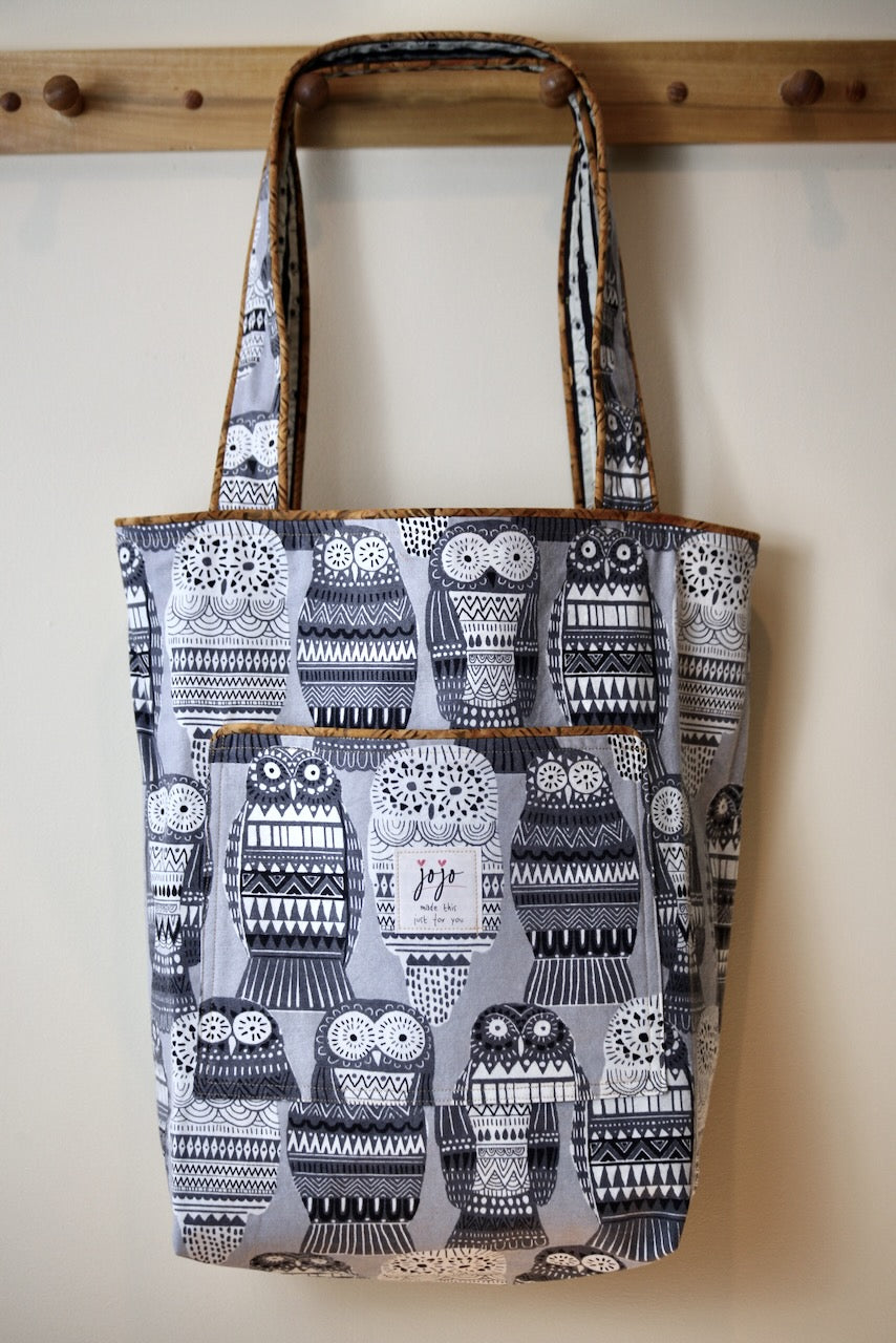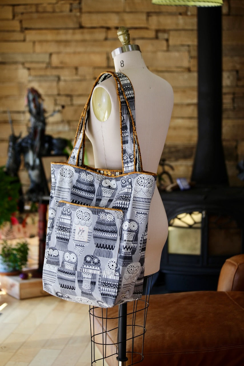 This adorable owl-themed lightweight upholstery fabric reminds me of those Russian nesting dolls, and I laughed out loud when I saw it at Foam & Fabric Outlet. I knew it would be a perfect match with Charley Harper’s design from Harvest Volume 1 for Birch Fabrics. The owls and eyes peering through the trees in a spooky dark forest work so well with the Russian owls! The piping is from my stash and gives the bag a nice pop of color that adds to the delight.
